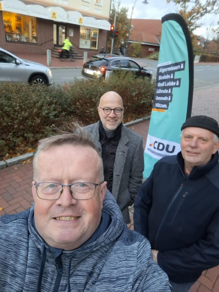 Am 30. Oktober 2025 hat der CDU-Gemeindeverband gemeinsam mit Vertretern weiterer politischer Parteien aus der Gemeinde vor dem Rathaus in Algermissen Position bezogen. Ziel war, auf das politische Angebot der demokratischen Parteien vor Ort aufmerksam zu machen und jenseits von derzeit in den Medien viel diskutierter Landes- und Bundespolitik konkret zu Themen in unserer Gemeinde zu informieren.
