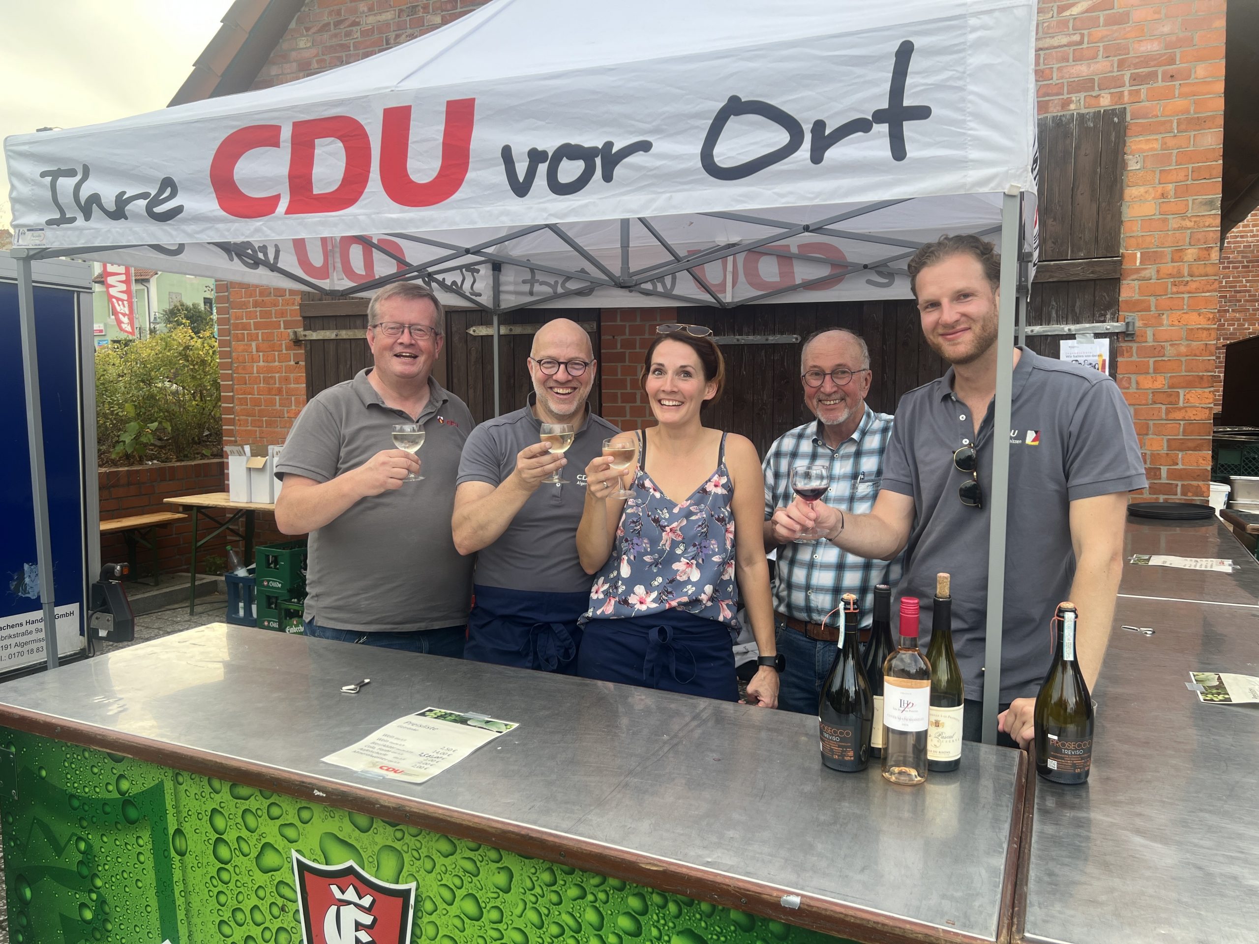 Bei herrlich sonnig-warmem Spätsommerwetter verwandelte sich der Platz vor dem Algermissener Heimatmuseum Ende September wieder zum traditionellen Weinfest des CDU-Gemeindeverbandes. Dabei stand auch in diesem Jahr geselliges Beisammensein unter Einbeziehung ortsansässiger Unternehmen im Vordergrund. So ließen sich die vielen Besucher das gastronomische Angebot an Weinen von Barrique aus Groß Lobke, kühlen Softgetränken von REWE Rudat und den beliebten Algermissener Rahmfladen von der Bäckerei Wucherpfennig aus dem Holzbackofen schmecken. Für musikalisch gute Stimmung sorgten die „Unsinnbach-Musikanten“.